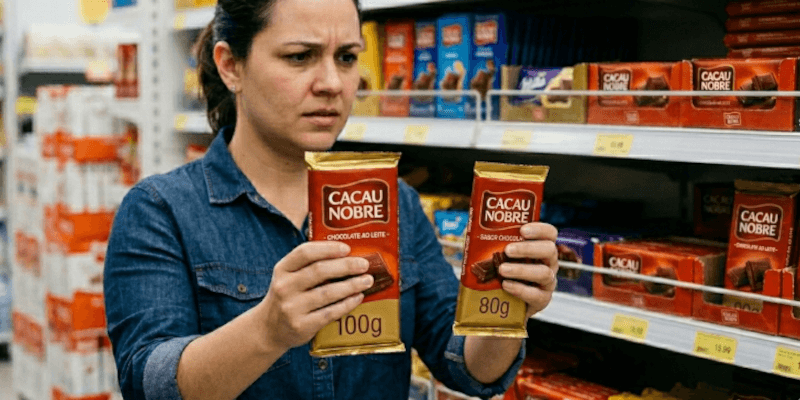 Basicamente, o preço do produto continua igual, mas o tamanho, peso ou volume diminui. Você pode observar isso quando aquele chocolate que pesava 100g, agora pesa 80g, ou quando o pacote de biscoito diminui as unidades.